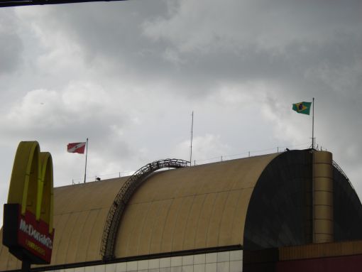 A referência é a frente do shopping. Assim, a ordem das bandeiras está trocada.